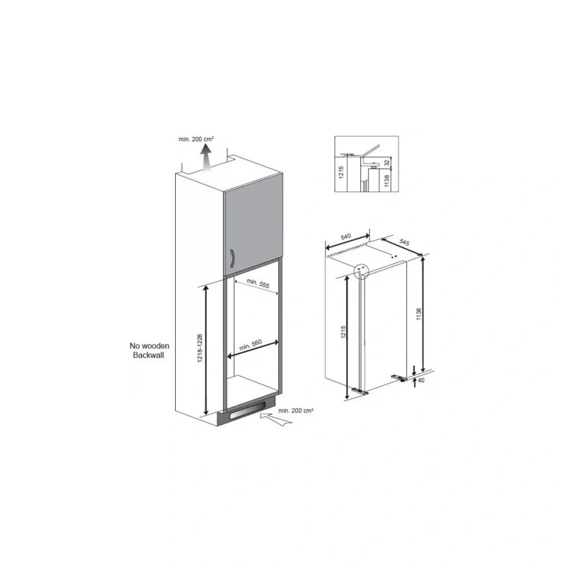 1-ukseline integreeritav külmik jääkambriga, külmkambri netomaht 156 l, jääkambri netomaht 19 l, külmkambril automaatsulatus, energiaklass E, energiatarve 152 kWh aastas, külmutusvõimsus 2 kg/24h, külmapidavus 16 h, müratase 35 dB, k*l*s 121,5*54*54,5 cm