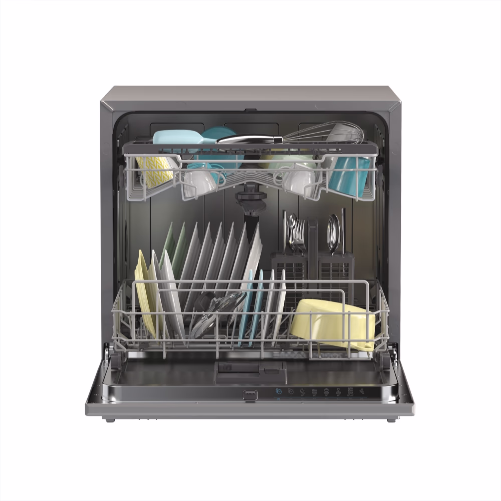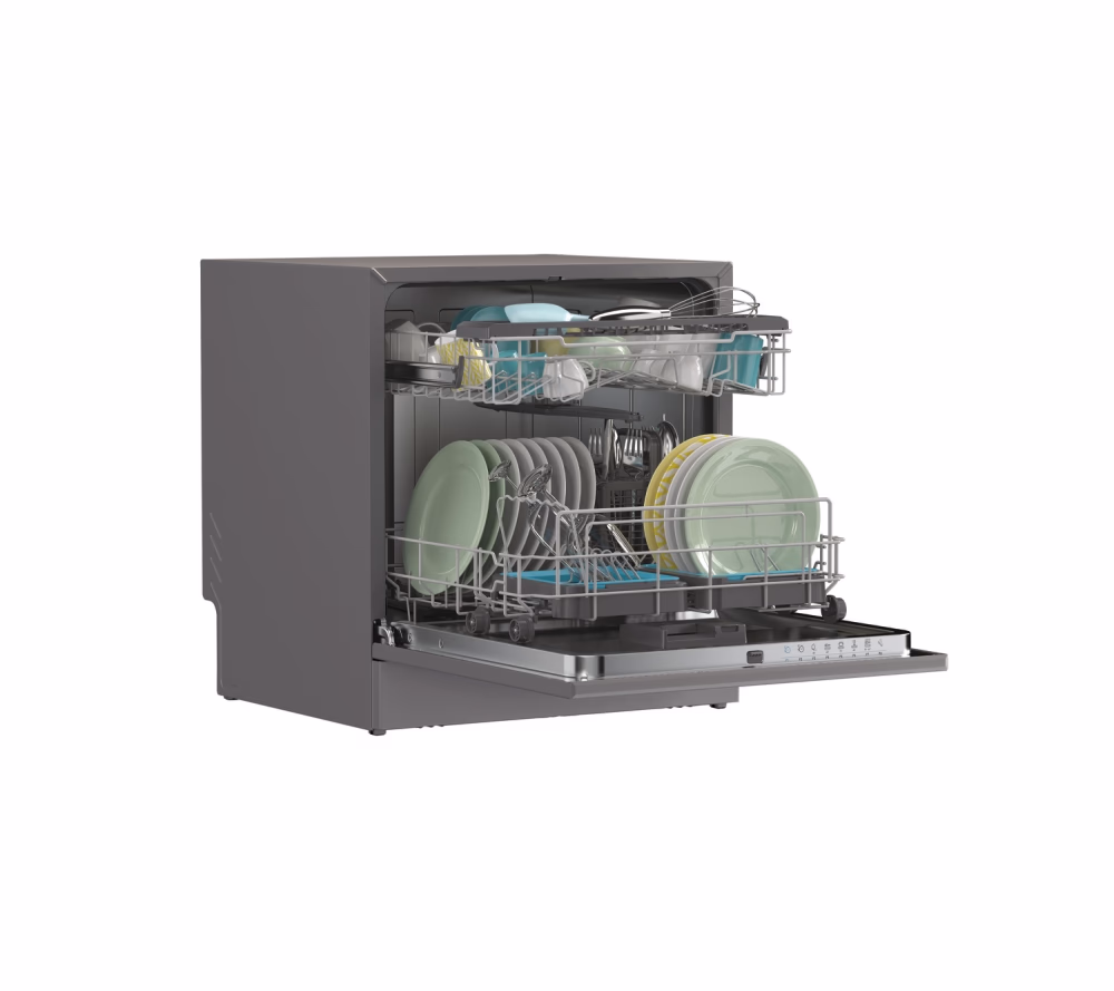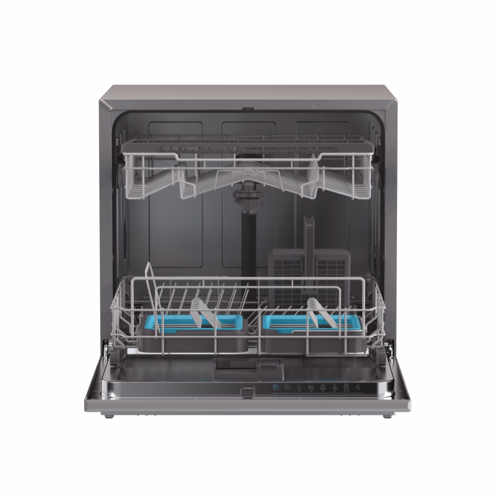 Mahutavus 8 nõudekomplekti. Energiaklass F, pesuklass A, 8 programmi. Veekulu standardtsükli kohta: 8 l. Müratase 49 dB, viitstart 1-23 h, soola lisamise indikaator, kaetud kütteelement, kondenseeriv kuivatus, k*l*s 59,5*55*50,1 cm, värv hõbedane