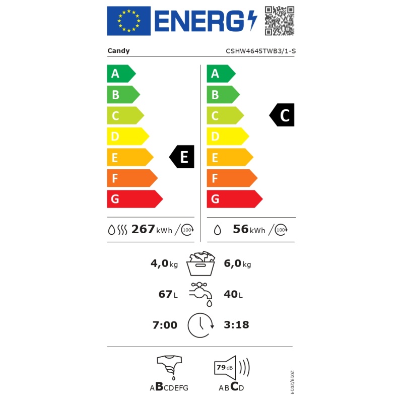 Candy CSWH4645TWB3/1-S sügavusega vaid 45 cm pesumasin-kuivati 6/4 kg, 1400 p/m, auruf-n, WiFi