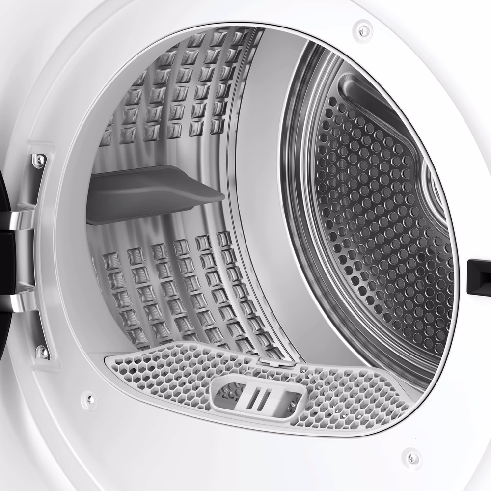 Soojuspumbaga kondenseeriv kuivati, energiaklass D, maksimaalne täitmiskogus 7 kg, 16 programmi, helisignaal, invertermootor, digitaalne näidik, viitstart 0-24 h, "Veepaak täis" indikaator, "Puhasta ebemefiltrit" indikaator, juhtpaneeli lapselukk, trumli kahesuunaline liikumine, müratase 64 dB, k*l*s 85*59,5*54,1 cm, värv valge