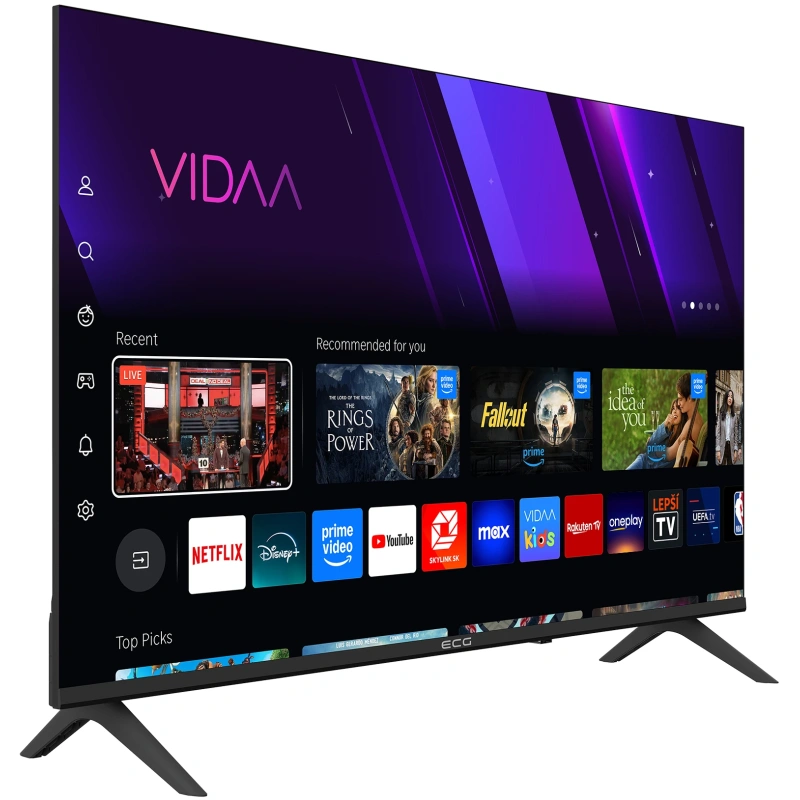 Kasutajasõbralik keskkond VIDAA U9 operatsioonisüsteem, millega ECG 40 FSV252 teler on varustatud, käivitub hetkega ja selle edasine toimimine on samuti kiire. Samal ajal pakub see intuitiivset menüüd ja hõlpsat juurdepääsu mitmetele populaarsetele platvormidele – saate nautida Netflixi, YouTube'i, Disney+, Amazon Prime Videot ja teistele. Sellel teleril saab igaüks nautida meelelahutust vastavalt oma maitsele. Selle teleri kõigi funktsioonide tõrgeteta toimimise tagab neljatuumaline protsessor koos 1 GB operatsioonisüsteemi ja 4 GB sisemäluga.