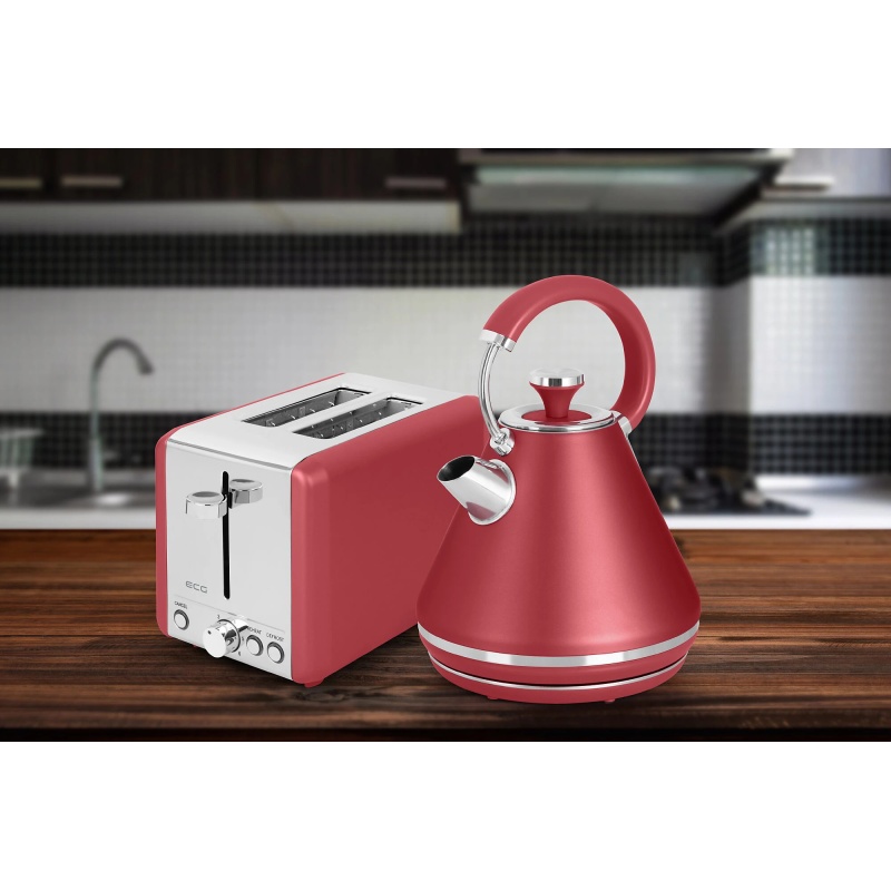 Klassikalises retrostiilis matti punast värvi veekeetja mahutavusega 1,7 l, võimsus 2200 W, roostevabast terasest sisepind, 360° alusel pöörlev, kaetud küttekeha, katlakivifilter, automaatne väljalülitus, helisignaal, toitejuhtme pikkus 70 cm.