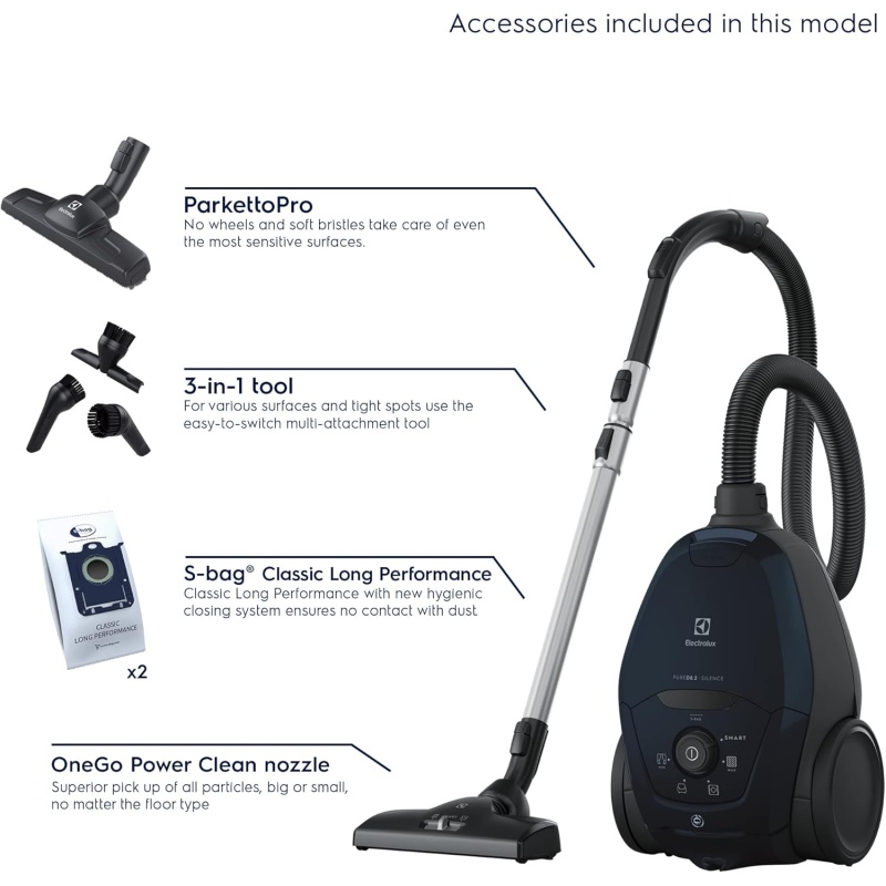 Nimivõimsus 600 W, max võimsus 700 W, teleskooptoru, pehmed rattad, OneGo Power Clean otsik, ParkettoPro parketihari, tolmukoti maht 3,5 l, tolmukotid S-bag, toitejuhe 9 m, tööraadius 12 m, pestav Hygiene 12 filter, värv: tumesinine.