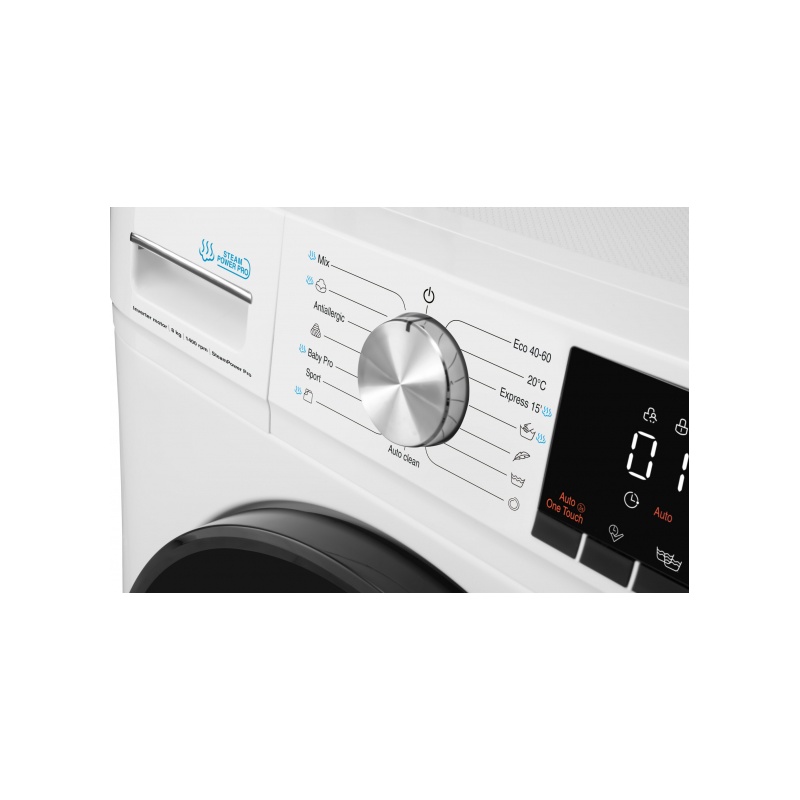 Mahutavus 8 kg, energiaklass A, tsentrifuug C, 0-1400 p/min, 15 programmi, inverermootor, aurf-n, reguleeritav tsentrifuug, lastelukk, viitstart, müratase 76 dB, k*l*s 85*60*45,7 cm, värv valge