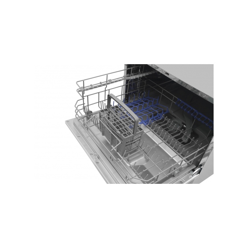 Mahutavus 6 nõudekomplekti. Energiaklass F, 5 programmi, 4 temperatuuti. Veekulu standardtsükli kohta: 6,5 l. Müratase 49 dB, viitstart 2-4-8 h, soola lisamise indikaator, kaetud kütteelement, jääksoojusega kuivatus, helisignaal programmi lõppemisel, sooja veega ühendamise võimalus, k*l*s 43,8*55*50 cm, värv hõbedane
