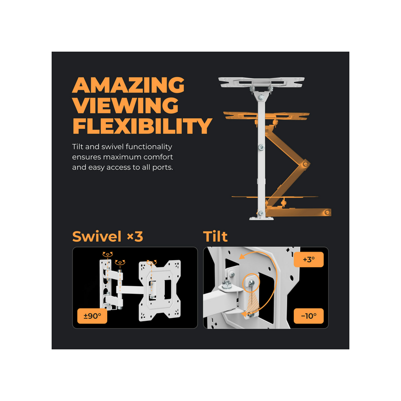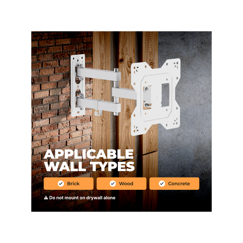 KIVI Motion-223W teleri kinnitus. Elegantne disain ja praktiline funktsionaalsus. Valge viimistlus lisab teie interjöörile värske ja kaasaegse ilme, tagades samal ajal kindla ja turvalise kinnituse 23–43-tollistele teleritele, mis kaaluvad kuni 30 kg.