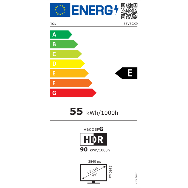TCL 55V6C. Display diagonal: 139.7 cm (55"), Display resolution: 3840 x 2160 pixels, HD type: 4K Ultra HD, Display technology: DLED, Screen shape: Flat, LED backlighting type: Direct-LED. Smart TV. Motion interpolation technology: PPI (Picture Performance Index) 2500, Display brightness: 270 cd/m², Response time: 6.5 ms, Contrast ratio (typical): 3000:1. Digital signal format system: DVB-C, DVB-S2, DVB-T2. Wi-Fi, Ethernet LAN. Product colour: Metallic
